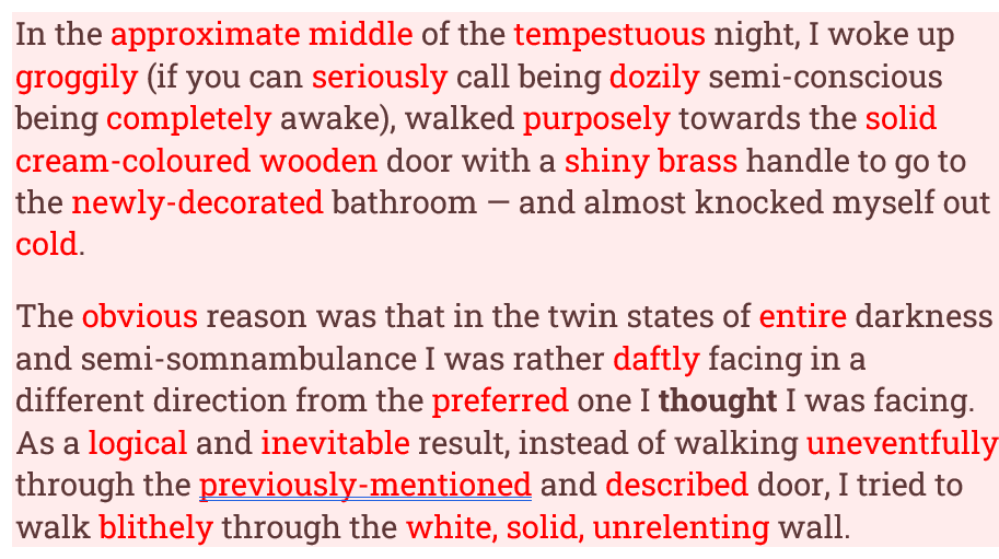 Well, I think you’ll agree that it’s all a bit too much. Admittedly, there were one or two adverbs and adjectives in the original which managed to slip through without causing a stir, but you could hardly miss that lot in the screenshot1.