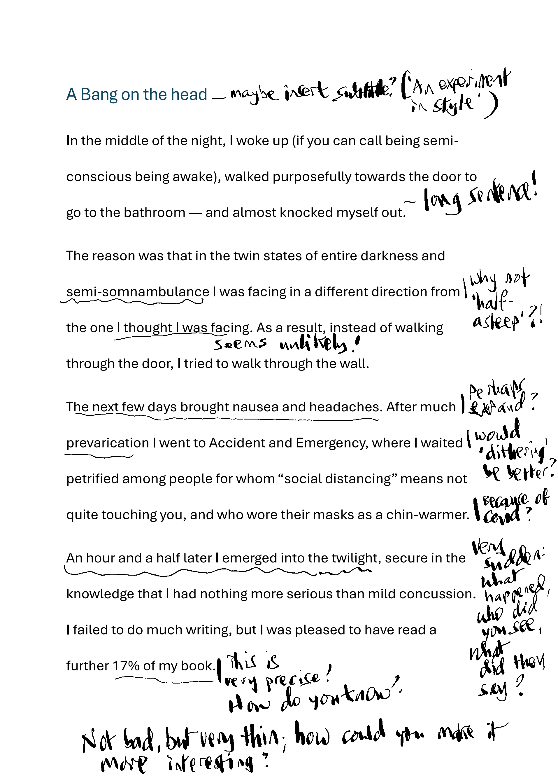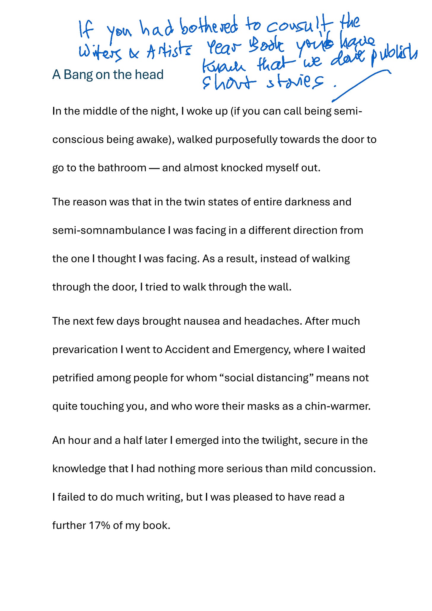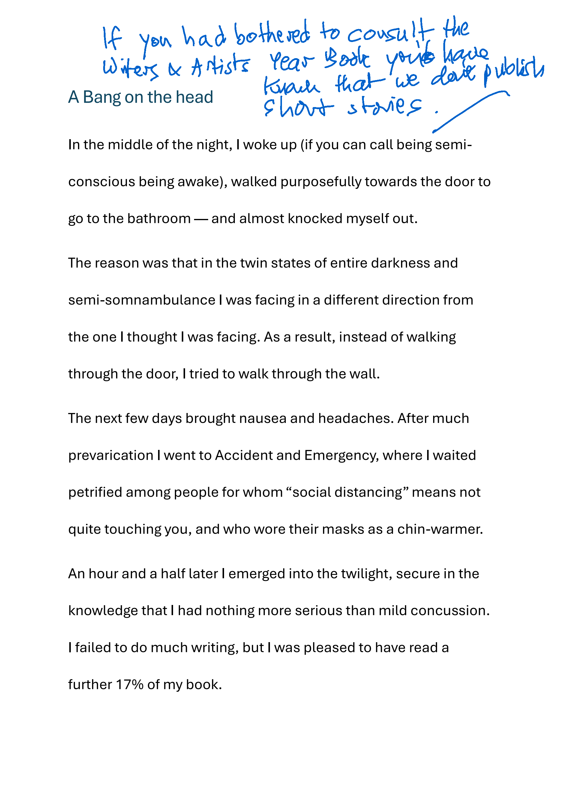 An hour and a half later I emerged into the twilight, secure in the knowledge that I had nothing more serious than mild concussion. I failed to do much writing, but I was pleased to have read a further 17% of my book.