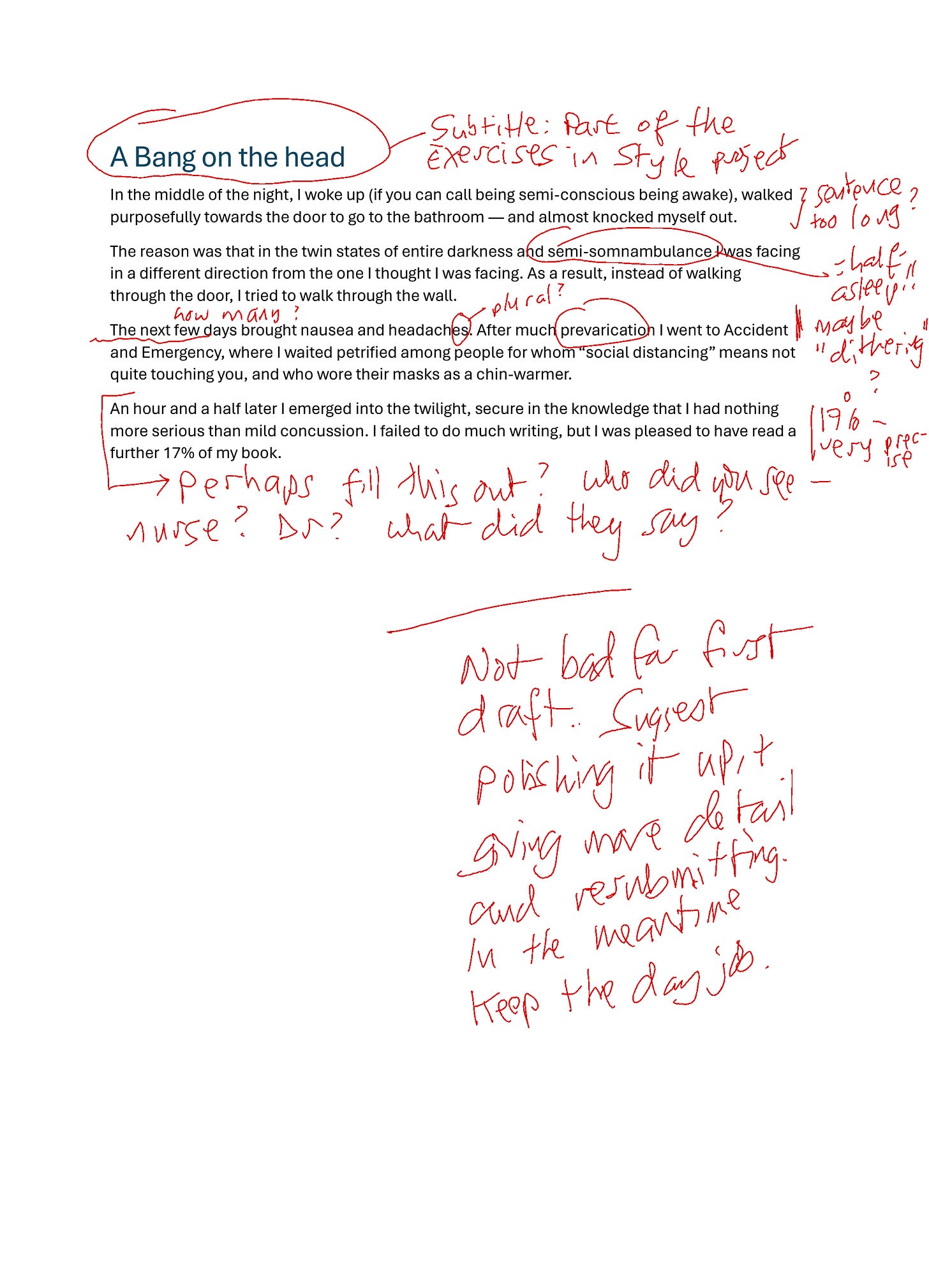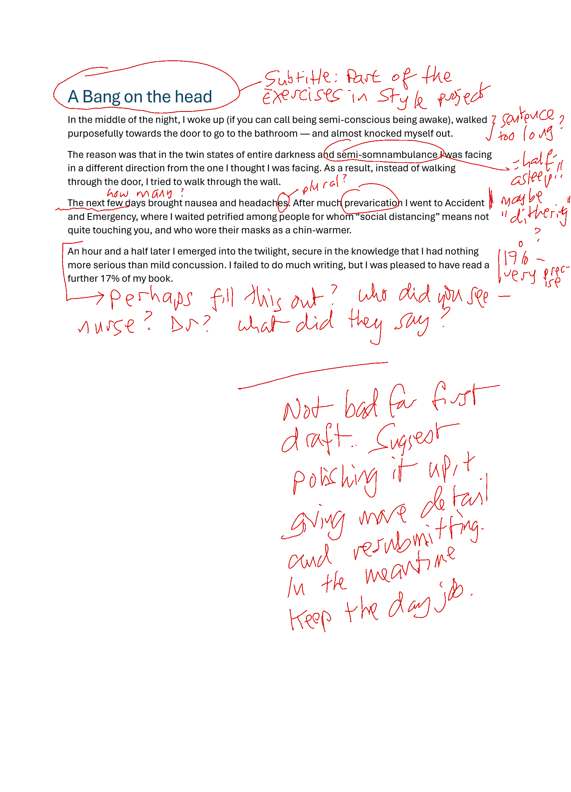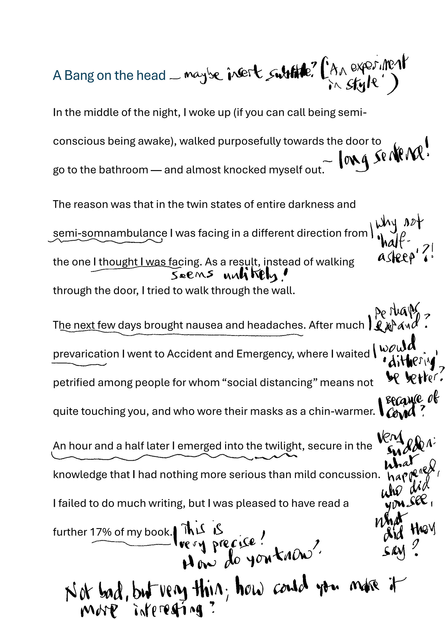 An hour and a half later I emerged into the twilight, secure in the knowledge that I had nothing more serious than mild concussion. I failed to do much writing, but I was pleased to have read a further 17% of my book.