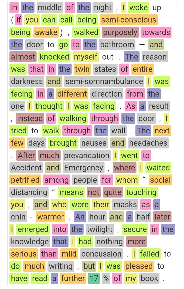 An hour and a half later I emerged into the twilight, secure in the knowledge that I had nothing more serious than mild concussion. I failed to do much writing, but I was pleased to have read a further 17% of my book.