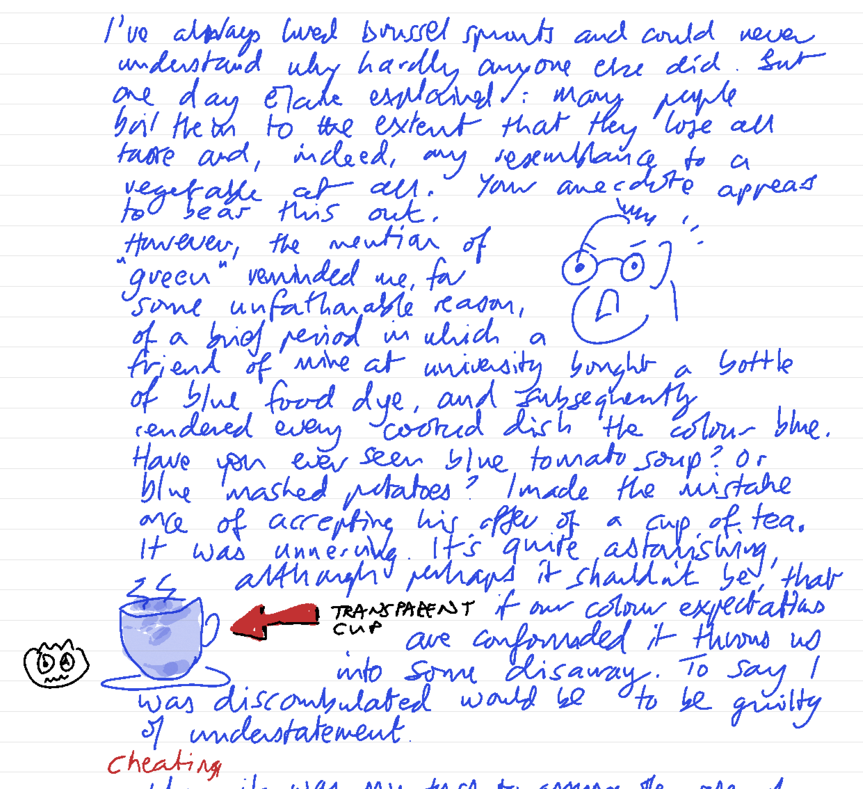I've always loved Brussels sprouts and could never understand why hardly anyone else did, but one day Elaine explained: many people boil them to the extent that they lose all taste and, indeed, any resemblance to a vegetable at all. Your anecdote appears to bear this out. However, the mention of "green" reminded me, for some unfathomable reason, of a brief period in which a friend of mine at university bought a bottle of blue food dye, and subsequently rendered every cooked dish the colour blue. Have you ever seen blue tomato soup? Or blue mashed potatoes? I made the mistake once of accepting his offer of a cup of tea. It was unnerving. It's quite astonishing, although perhaps it shouldn't be, that if our colour expectations are confounded it throws us into some disarray. To say I was discombobulated would be to be guilty of understatement.